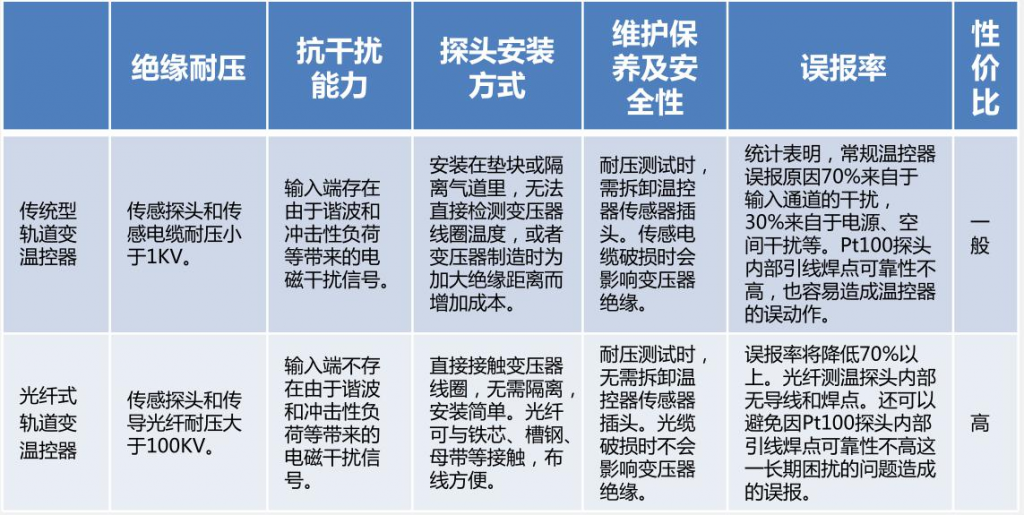 以傳統型軌道交通溫控器與光纖式軌道交通溫控 器的應用做對比,如下表: