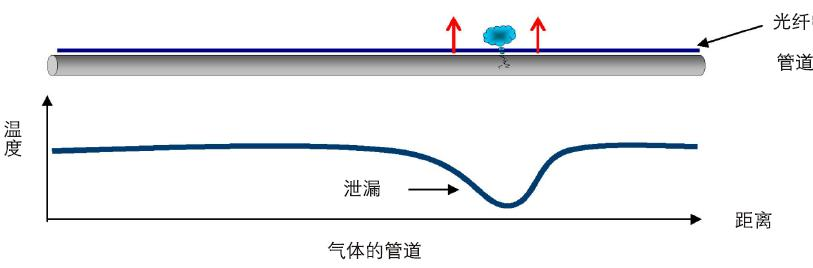 油氣管道泄漏時(shí)會(huì)引起泄漏點(diǎn)周圍溫度的變化,通過(guò)分布式光纖溫度傳感系統(tǒng)可以準(zhǔn)確定位泄漏點(diǎn)。在天然氣管線介質(zhì)泄漏受壓情況下,氣態(tài)物質(zhì)導(dǎo)致的泄漏點(diǎn)的低溫,是由物質(zhì)的物理性質(zhì)、工藝條件和周圍環(huán)境所決定的。這些點(diǎn)的溫度異??赏ㄟ^(guò)分布式溫度測(cè)量而獲得,并有很好的溫度、距離和反應(yīng)時(shí)間精度。管道本身發(fā)生泄漏事故時(shí),泄漏出的天然氣由于存在壓力,會(huì)向管道周圍發(fā)出噴射狀的氣體。如果能對(duì)整條天然氣管道在現(xiàn)有的壓力、流量探測(cè)技術(shù)基礎(chǔ)上,利用沿管道敷設(shè)的通訊光纜,接入分布式光纖測(cè)溫傳感主機(jī),就能夠?qū)崟r(shí)探測(cè)到泄漏點(diǎn),并進(jìn)行泄漏點(diǎn)的定位和報(bào)警顯示。