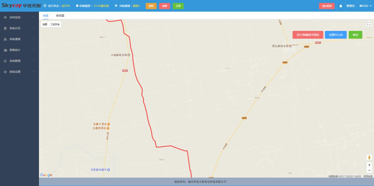 天然氣管線泄漏安全監(jiān)測(cè)系統(tǒng)采用目前先進(jìn)的管道溫度系統(tǒng)監(jiān)測(cè)技術(shù)。僅用天然氣管線中的通訊光纜的一根光纖就可實(shí)現(xiàn)長(zhǎng)達(dá)幾十公里的天然氣管道泄漏定位報(bào)警。通過(guò)基于通訊光纜的分布式光纖測(cè)溫技術(shù),對(duì)天然氣管線進(jìn)行在線溫度分布監(jiān)測(cè),就能夠通過(guò)管道溫度異常點(diǎn)的探測(cè),準(zhǔn)確發(fā)現(xiàn)管道的泄漏點(diǎn),并及時(shí)的進(jìn)行報(bào)警和定位。如果天然氣管線發(fā)生泄漏,高壓氣體的體積膨脹將引起漏點(diǎn)附近溫度的下降,分布式光纖測(cè)溫系統(tǒng)同樣可通過(guò)溫度異常點(diǎn)的探測(cè),發(fā)現(xiàn)并定位天然氣管線的泄漏點(diǎn)。通過(guò)對(duì)天然氣管線進(jìn)行在線的分布式溫度監(jiān)測(cè),并將系統(tǒng)設(shè)備接入管道監(jiān)測(cè)系統(tǒng)局域網(wǎng),通過(guò)網(wǎng)絡(luò)信號(hào)可將溫度信息上傳給中央服務(wù)器。可在整個(gè)天然氣管線線路發(fā)生管道泄漏以及事故初期階段,第一時(shí)間發(fā)現(xiàn)并報(bào)告預(yù)警點(diǎn)的具體位置、溫度變化、溫度下降走向等信息數(shù)據(jù),為天然氣管線管理部門及其它相關(guān)部門及時(shí)定位、分析可能發(fā)生的管道泄漏事故提供可靠堅(jiān)實(shí)的信息獲取手段,為天然氣管線系統(tǒng)安全運(yùn)行提供高效的安全保障。本系統(tǒng)具有本質(zhì)防爆、抗強(qiáng)電磁干擾、電絕緣性好、防雷擊、高精度、重量輕、體積小等優(yōu)點(diǎn),適合在易燃、易爆等高危環(huán)境應(yīng)用。設(shè)備聯(lián)網(wǎng)后,通過(guò)載入百度地圖顯示光纜所在位置地圖,并設(shè)定中心點(diǎn),選定當(dāng)?shù)厮谖恢茫筛鶕?jù)管道的走向在地圖上標(biāo)出光纜走向圖,當(dāng)發(fā)生報(bào)警時(shí),界面會(huì)出現(xiàn)一個(gè)彈窗,顯示報(bào)警地點(diǎn),報(bào)警時(shí)間等。