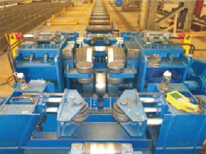 本機主要包括主機部分、前后液壓浮動輥道、液壓系統(tǒng)、電氣系統(tǒng)及其它輔件。主機前后各設一套液壓頂升裝置, 利用主傳動輥作為支點,其中一套液壓頂升裝置作頂升動力頭用來矯正T型材的上拱。主機前側(cè)左右各設一套液壓頂升裝置,主機后側(cè)各設二套液壓頂升裝置,利用同一側(cè)的兩套頂升裝置作支點另一側(cè)一套液壓頂升裝置作壓頭,用來矯正T型材的旁彎。